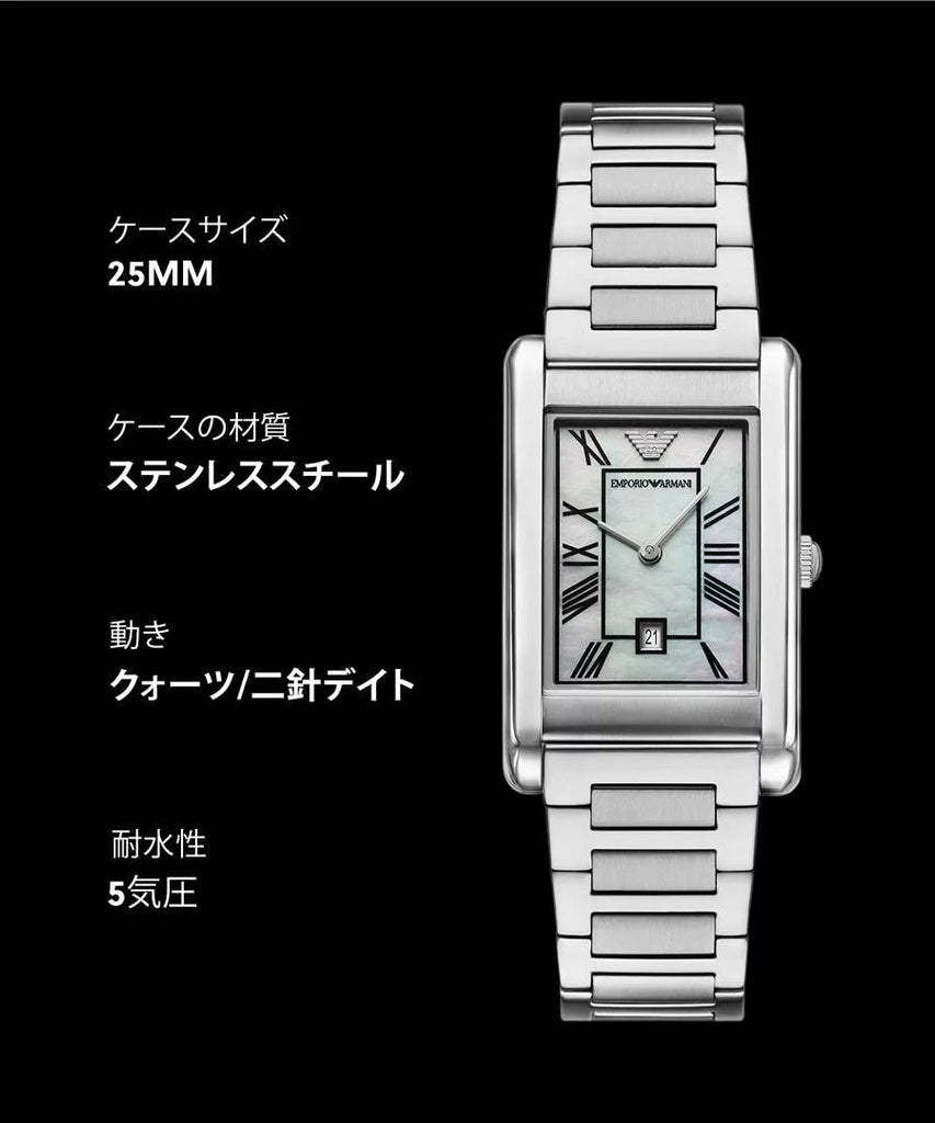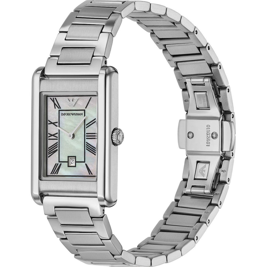 - Emporio Armani's 25 x 38mm stainless steel watch is distinguished from the crowd. Featuring a sleek rectangular case and a two-hand date quartz movement, this timepiece stands out with its glossy mother-of-pearl dial adorned with black Roman numeral indexes. The stainless steel H-link bracelet adds a touch of refinement, making it perfect for any dress occasion.