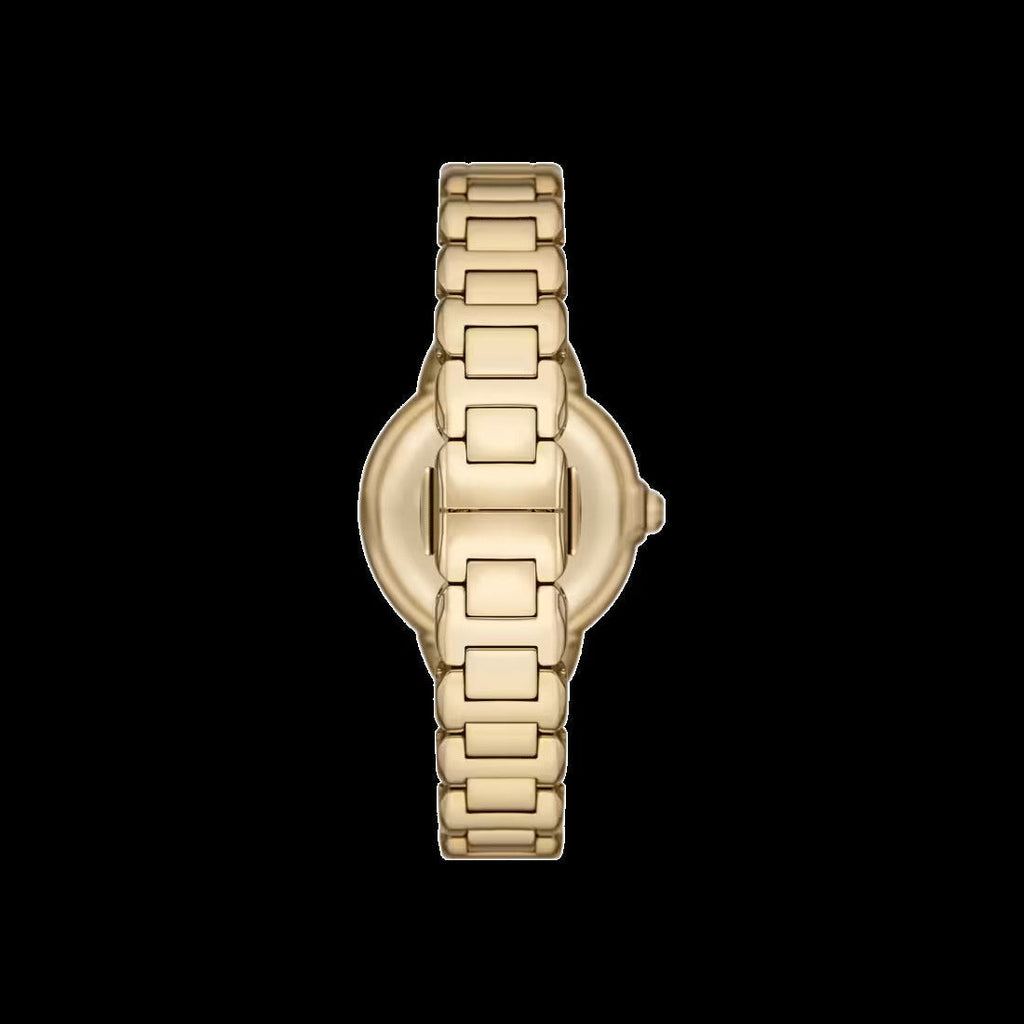 Emporio Armani's 32mm watch features an eggshell sunray dial, three-hand movement and gold-tone stainless steel bracelet. This wristwatch from Armani Exchange is crafted for the moments that matter most. The watch dial is protected with mineral glass and is water resistant up to 50 m. The timepiece works on a quartz movement.