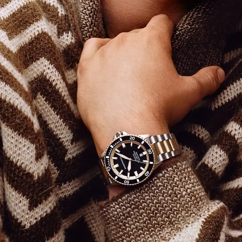 The Emporio Armani Sea Explorer AR60089 is a striking timepiece with a bold round face and a contrasting bezel that draws attention. The watch features a 42 mm diameter, making a strong statement on the wrist. Its black dial is adorned with prominent hour markers and hands, offering clear readability. The case, in a captivating gold hue, pairs seamlessly with the dual-tone bracelet, which combines gold and silver links for a unique look. The bracelet's alternating links add visual interest and character, while the fold-over clasp ensures a secure fit.