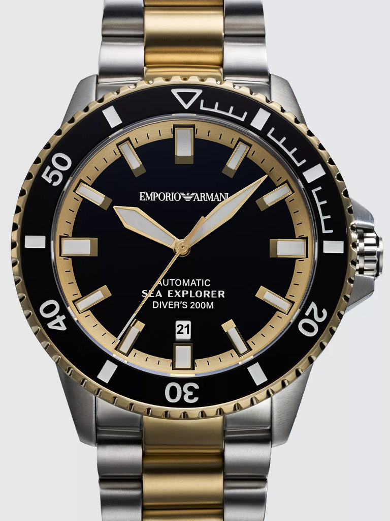 - Emporio Armani's Sea Explorer is a 42.5mm automatic dive watch featuring sapphire crystal and Super-LumiNova on hands, indexes and bezel markings for optimal visibility in dark underwater conditions. As indicated by the "Diver's" marking on the dial, this watch is ISO 6425 certified, making it expertly equipped for deep-sea diving up to 200 meters. This iteration boasts a glossy black enamel dial and an integrated two-tone stainless steel bracelet.