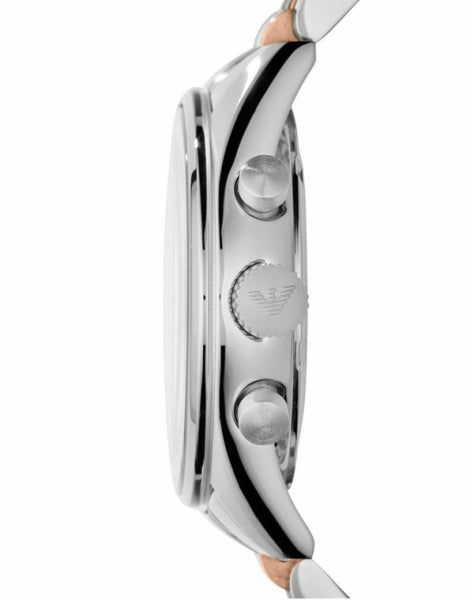 Japanese Made Quartz Chronograph Movement. 43mm x 11mm Brushed Stainless Steel Case. Polished Stainless Steel Bezel. Solid Caseback. Scratch-Resistant Mineral Glass. Push-Pull Crown.Silver Dial. Rose Gold Plated Stainless Steel Hands and Indexes. Date between 4 and 5 O'Clock. 3 Sub-Dials Displaying: 60 seconds, 60 minutes, and 24 hours.22mm Width Two-Tone Rose Gold Plated Stainless Steel Bracelet with Hidden Push Deployment Clasp.Water Resistant to 50 Meters 5ATM.This watch is Brand New and comes with the correct Box and Paperwork.