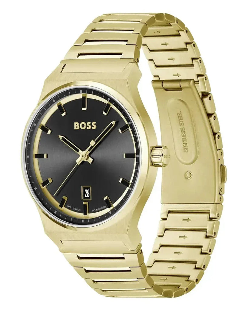 The Hugo Boss Candor combines timeless elegance with contemporary design, featuring a striking black dial that contrasts beautifully against its polished gold steel case and bracelet. This sophisticated timepiece delivers the refined aesthetic that defines the Hugo Boss brand, making it an ideal choice for professionals who demand both style and substance. The durable steel construction ensures lasting quality, while the classic design seamlessly transitions from boardroom to evening occasions. Perfect for the modern man who appreciates luxury without compromise.