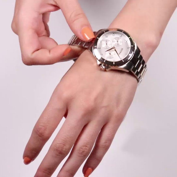 The three sub-dial chronograph function of this Hera watch by BOSS is neatly contained in a polished 38mm case. The watch catches the eye with its crystal hour markers that bring light and glamour to the wrist. Its three-link bracelet strap gives a weighty and a nice and comfortable feel on the wrist. It fastens with a folding clasp.