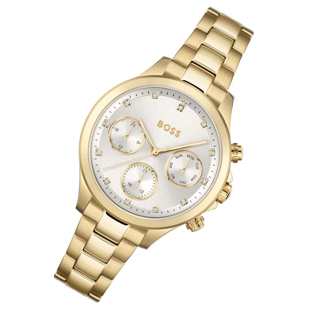 Experience the elegance of a Hugo Boss Gold Steel Silver White Dial Women's Multi-function Watch, crafted with an ionic thin gold plated 1 steel case and a mineral crystal material. Its exclusive features include a quartz multifunction movement, a 38 mm diameter case, and a 3 ATM water resistance. Finished with a push-button deployment clasp and a stylish silver white dial index, this luxury wristwatch is the perfect addition to your wardrobe.
