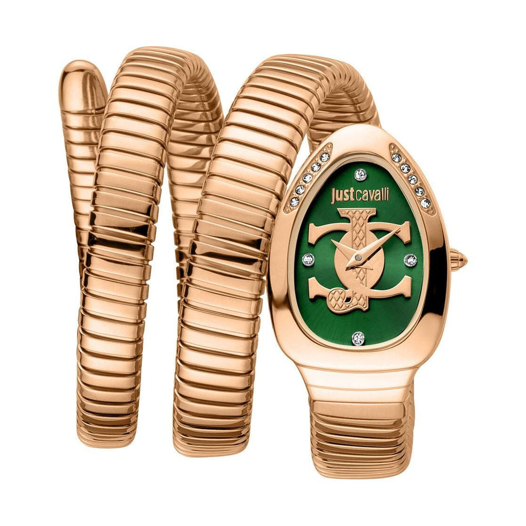 Serpentine elegance takes center stage in this Just Cavalli wristwatch, where a sleek rose gold-tone stainless steel band coils like a snake around the wrist. The green dial adds a striking contrast, capturing the brand’s signature wild spirit with refined sophistication.