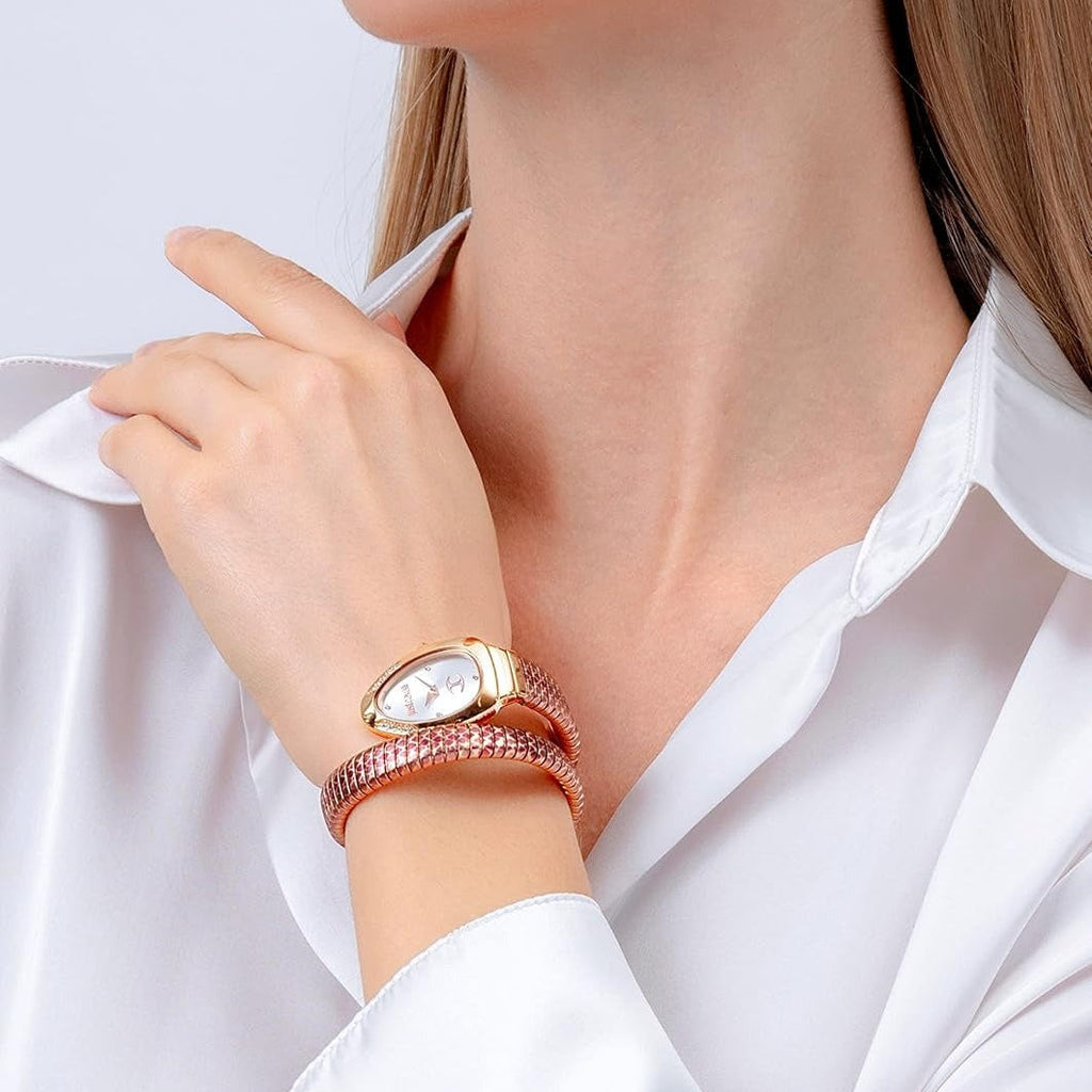 This watch has a stainless steel case in gold color, elegant and durable with white display. The gold color stainless steel strap adds a touch of class to the watch. The Just Cavalli Pelle Solo watch is an elegant and bold watch that will stand out on your wrist. Featuring a snake design on the dial, this watch is perfect for those who want to add a touch of class to their wardrobe.