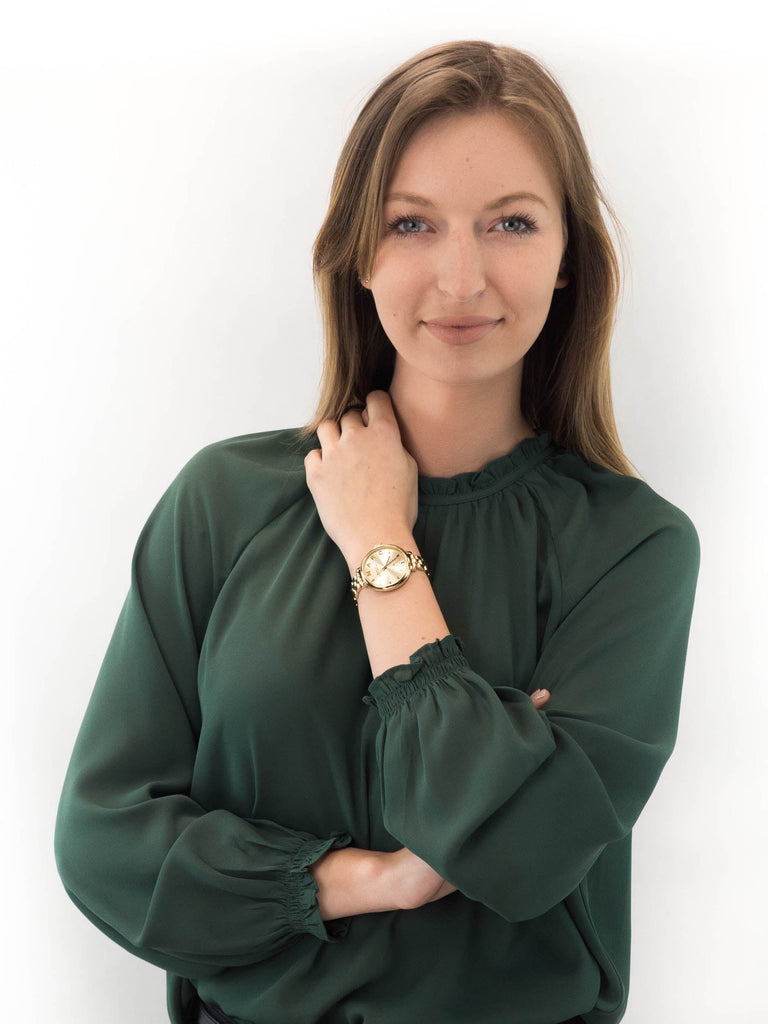 Marc Jacobs Sally Champagne Dial Gold-tone 36mm Ladies Watch comes in gold-tone stainless steel case and bracelet. Fixed gold-tone bezel. Champagne dial with gold-tone hands and index hour markers. Seconds sub-Dial at the 6 o'clock position. Dial Type: Analog. Quartz movement. Scratch resistant mineral crystal. Pull / push crown. Solid case back. Case diameter: 36 mm. Case thickness: 8 mm. Round case shape. Band width: 11.5 mm. Band length: 7 inches. Deployment clasp with push button release. Water resistant at 50 meters / 165 feet. Functions: hour, minute, second. Casual watch style.