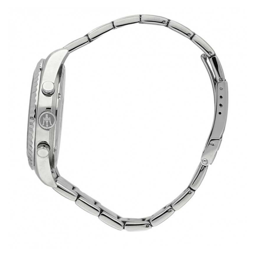 Maserati men's multifunction watch with quartz movement VX9JE. Stainless steel case with a diameter of 43 mm. Knurled steel bezel. Screw-down crown and case back to ensure greater water resistance. Silver analog dial with stick indexes, logo at the top and date display with day of the month and week. Silver hypoallergenic steel strap; deployant clasp with safety lock. Water resistant up to 100 meters deep. Belongs to the Competizione collection. The item is shipped complete with original packaging and 24-month authentic guarantee.