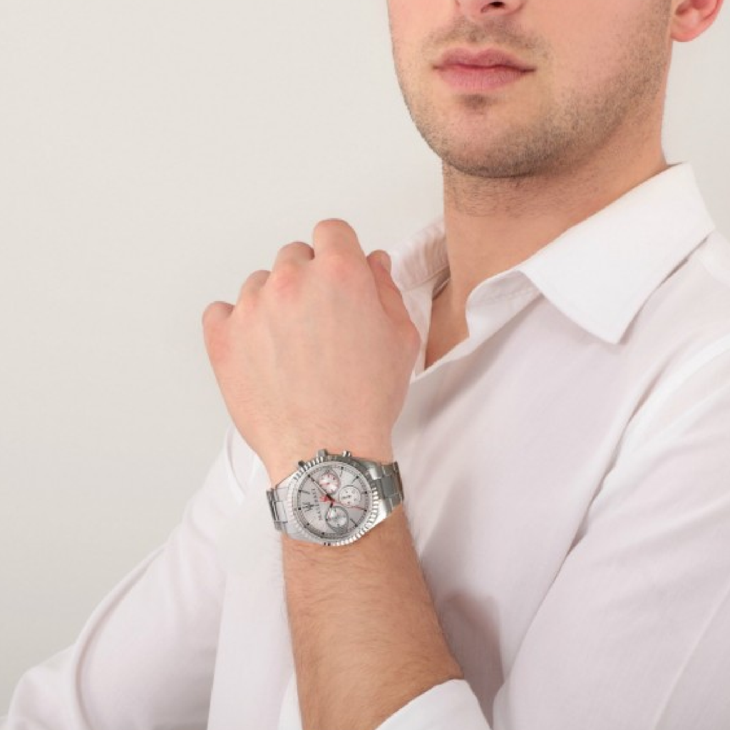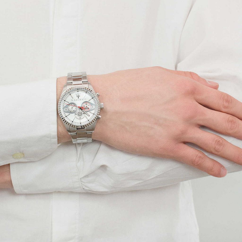 Experience elegance with the Maserati Competizione Chronograph Watch. With its striking white dial and silver steel strap, this watch is the perfect accessory for any stylish man. Featuring a reliable chronograph and the iconic Maserati logo, you'll make a statement wherever you go.