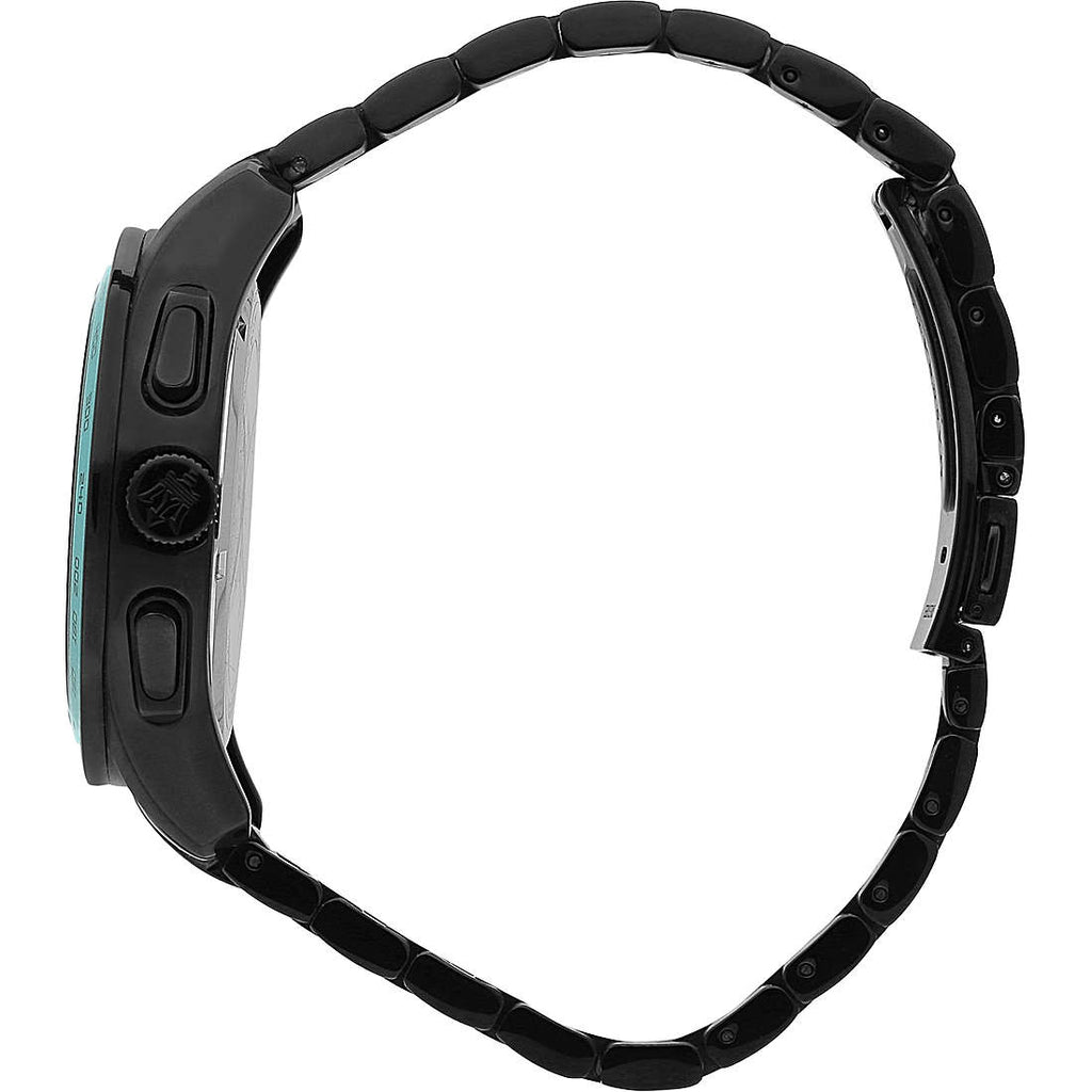44mm diameter men’s watch with QUARTZ precision chronograph mechanism. It has a black dial with blue indicators and details. Its case is black made of stainless steel, with a special hardened mineral crystal. It has a black PVD bracelet and a safety clasp. It is waterproof (10 ATMs).