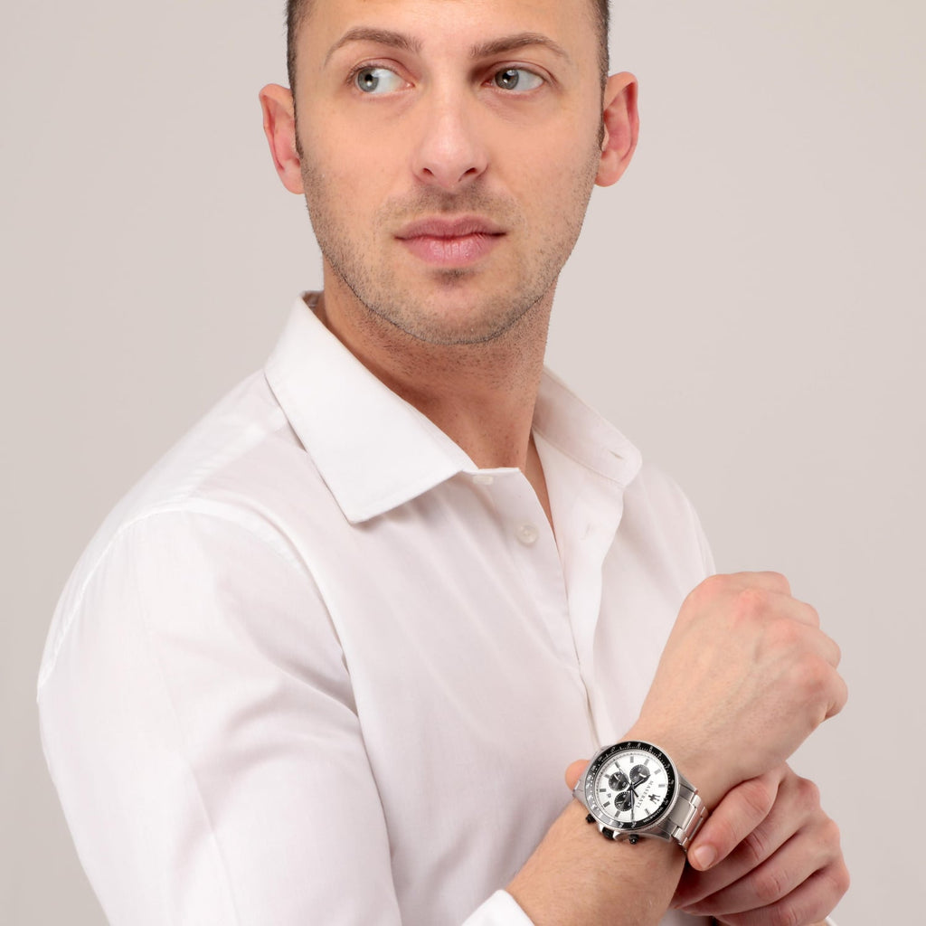 MASERATI watch SFIDA - R8873640003 - Case Material & Finish: Stainless Steel, Case width: 44mm, Strap Material: Metal , Strap Colour: Silver, Dial Colour: White, Water resistant: 10ATM, Crystal: Mineral crystal, Material: Stainless Steel, Case thickness: 11.40, Gender: Male, Buckle: Box buckle with pushers, Guarantee: Maserati 2 years guarantee, Packaging: Maserati original packaging, Battery change: Sì