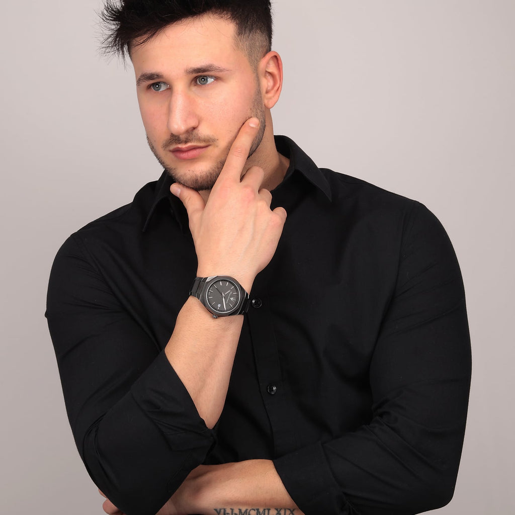 The round case is 45 mm wide and 10 mm height and, depending on individual taste, will adorn almost any wrist. The bezel, which is fixed, stands out discreetly from the case, as does the screwed crown. The case back of the watch is a stainless steel bottom, screwed, which sets the final point for a coherent design.