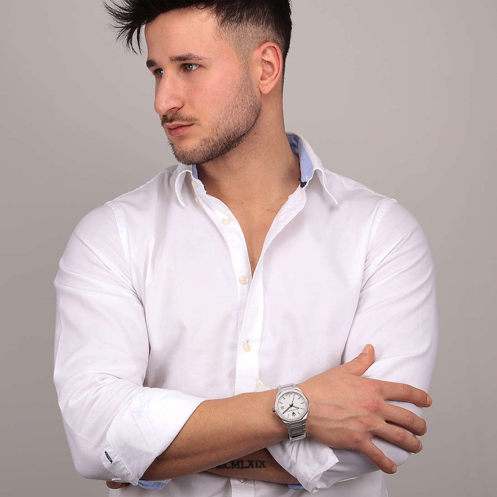 Sporty, lightweight, time only. 3H Stile Watch - White. The Tridente timepieces embody all of Maserati’s technical expertise and masterful design. Exclusive and inimitable models, with a rigorous design and exceptional functions. The watch case, bezel and bracelet are made of stainless steel. The silver-coloured hands contrast with the white dial. Three-hand watch with calendar - 42 mm steel case White dial Steel bracelet