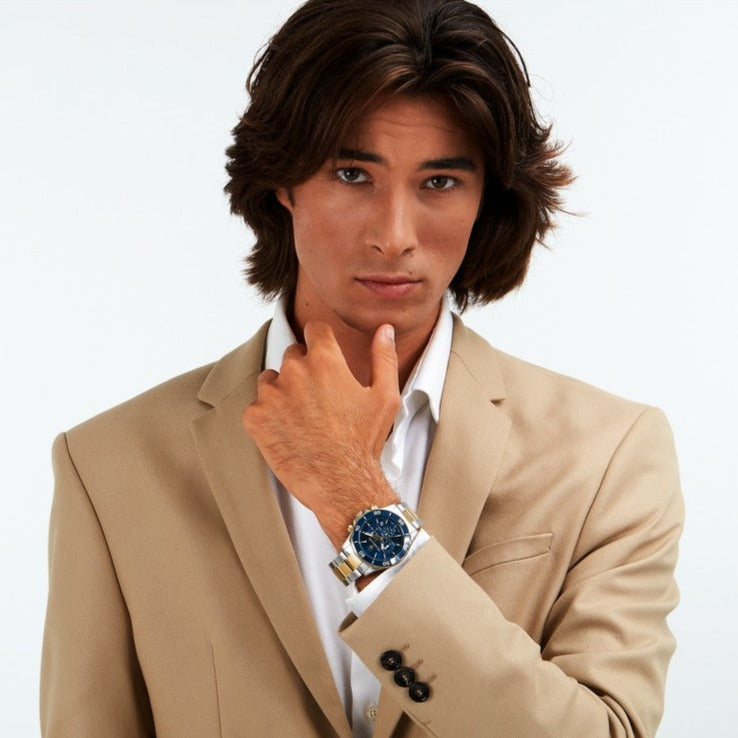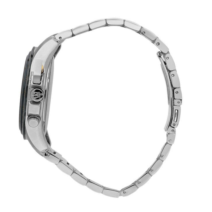 Maserati R8873612046 Men's Traguardo Limited Edition Collection Steel Case with Yellow Gold Details and Blue Bezel Quartz Movement Chronograph Function The watch features a steel strap and yellow gold details with hidden clasp.