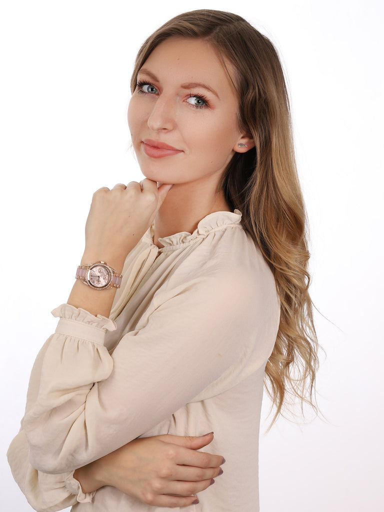 - Two-tone stainless steel and acetate watch with rose gold tone dial and case