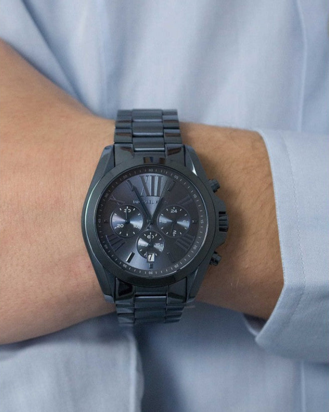 Menswear-inspired details like a sporty, oversized 43mm chronograph dial give the navy blue IP Michael Kors Bradshaw watch a bold look. The thick bracelet features polished and brushed links for a runway-inspired touch.