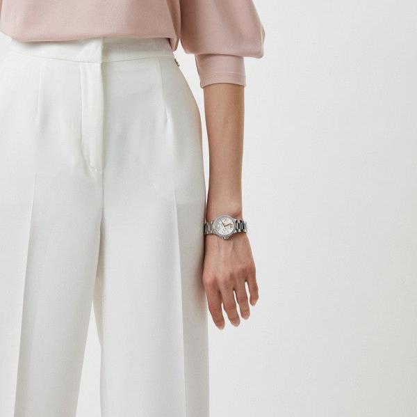 A women's watch by Michael Kors from the Camille series, with a stainless steel case decorated with zircons around the bezel and a steel bracelet. Its movement features a date display with a hand at 3, a day display with a hand at 9 and a 24-hour display with a hand at 6.