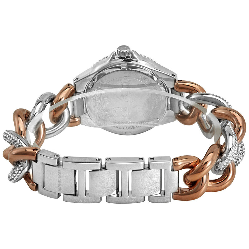 Stainless steel case with a two-tone (silver-tone and rose gold-tone) crystal-set stainless steel chain link bracelet. Fixed crystal-set rose gold-tone bezel. Silver-tone dial with rose gold-tone hands and index hour markers. A Roman numeral appears at the 12 o'clock position. Arabic numeral minute markers (at 5-minute intervals). Minute markers around the outer rim. Dial Type: Analog.