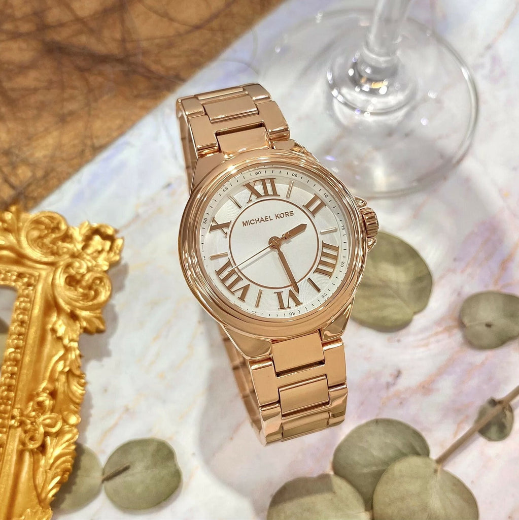 With its stunning rose gold steel strap and white dial, the Michael Kors Camille Quartz watch exudes elegance and sophistication. Crafted for women, this timepiece features precise quartz movement for accurate timekeeping. A perfect blend of style and functionality, it's a must-have for any fashion-forward individual.