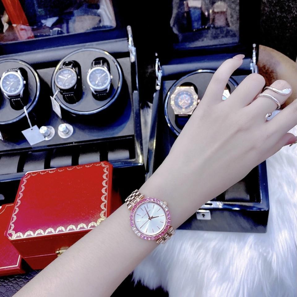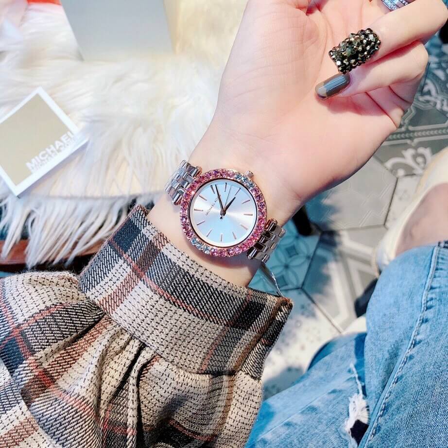 Elevate your look with the Michael Kors, a glamorous analog watch accented with rose-gold tone. A oversized rose-gold pavé-embellished bezel lends look-at-me flair, while the radiant a silver sunray dial with rose gold-tone stick indexes and a rose gold-tone stainless steel bracelet renders this timepiece exceptionally elegant. It is a refine addition to your everyday look.