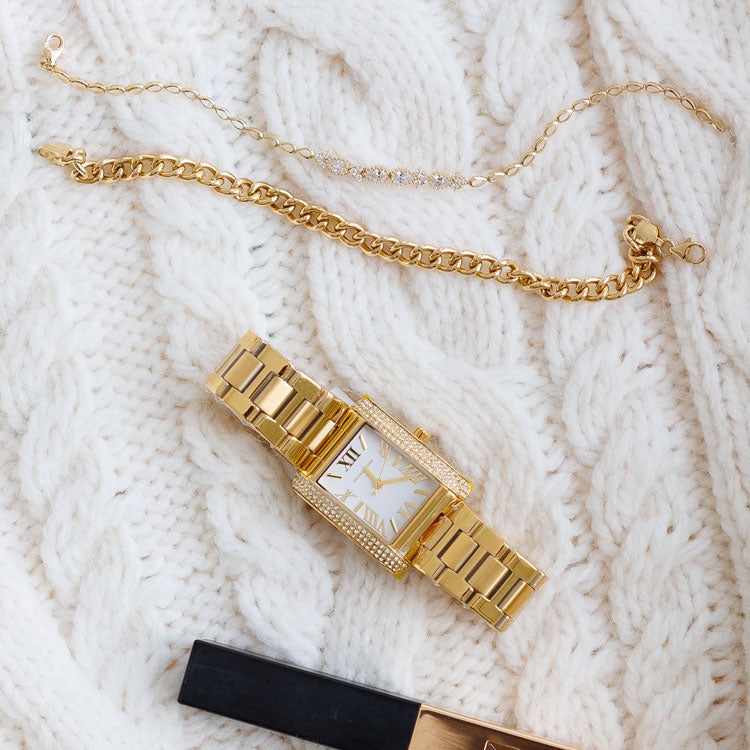 Meet Emery: a precious timepiece in a warm, opulent hue with pavé crystals that ensure to make a grand statement. Roman numeral time stops add classic appeal, while the polished beveled strap reads elegant. Consider it a glamorous piece to wear to an evening event
