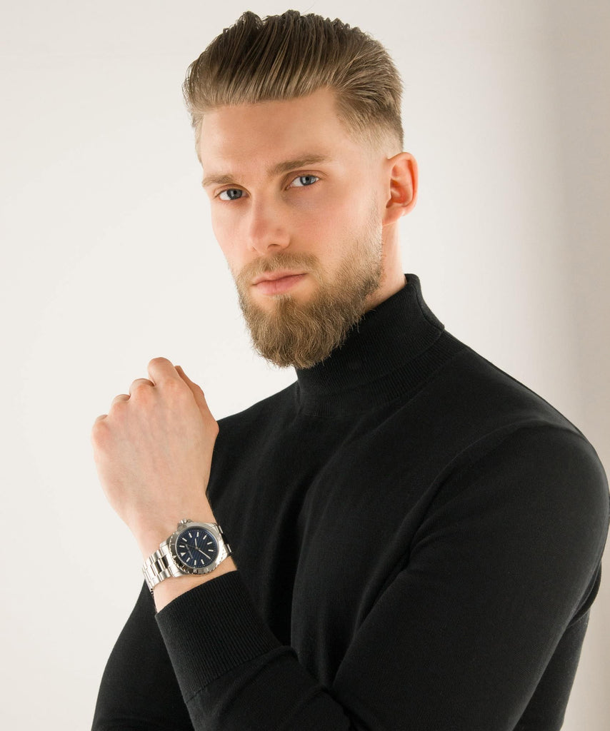 Our Men's Everest platform is updated for the season with a 40mm case size, and sleeker profile. Featuring a new textured dial with a three-hand movement, this slim stainless steel Everest maintains its iconic design details with a notched sport topring.
