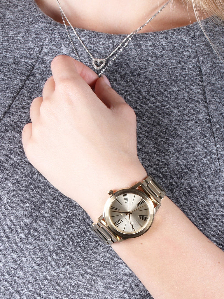Gold-tone stainless steel case with a gold-tone stainless steel bracelet. Fixed bezel. Gold-tone dial with gold-tone hands and index and Roman numeral hour markers. Dial Type: Analog. Quartz movement. Scratch resistant mineral crystal. Case diameter: 38 mm. Round case shape. Deployment clasp. Water resistant at 50 meters / 165 feet. Functions: hour, minute, second. Luxury watch style. Michael Kors Hartman Gold-Tone Stainless Steel Ladies Watch MK3490.