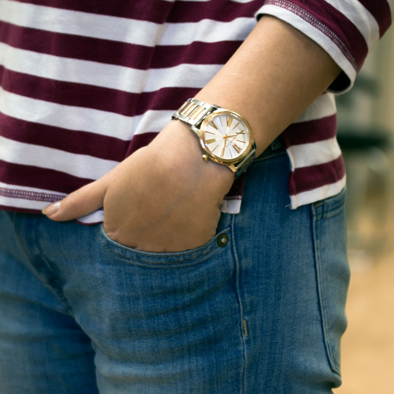 - Two-tone watch featuring brushed sunray dial with alternating stick and Roman numeral markers