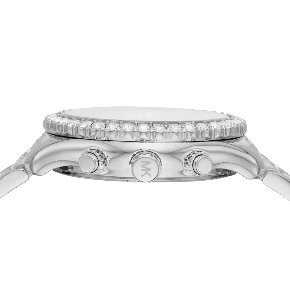 Michael Kors' 42mm Layton watch features a silver stingray pavé dial, silver case with oversized glitz topring, chronograph movement and stainless steel bracelet with stingray pavé center links.