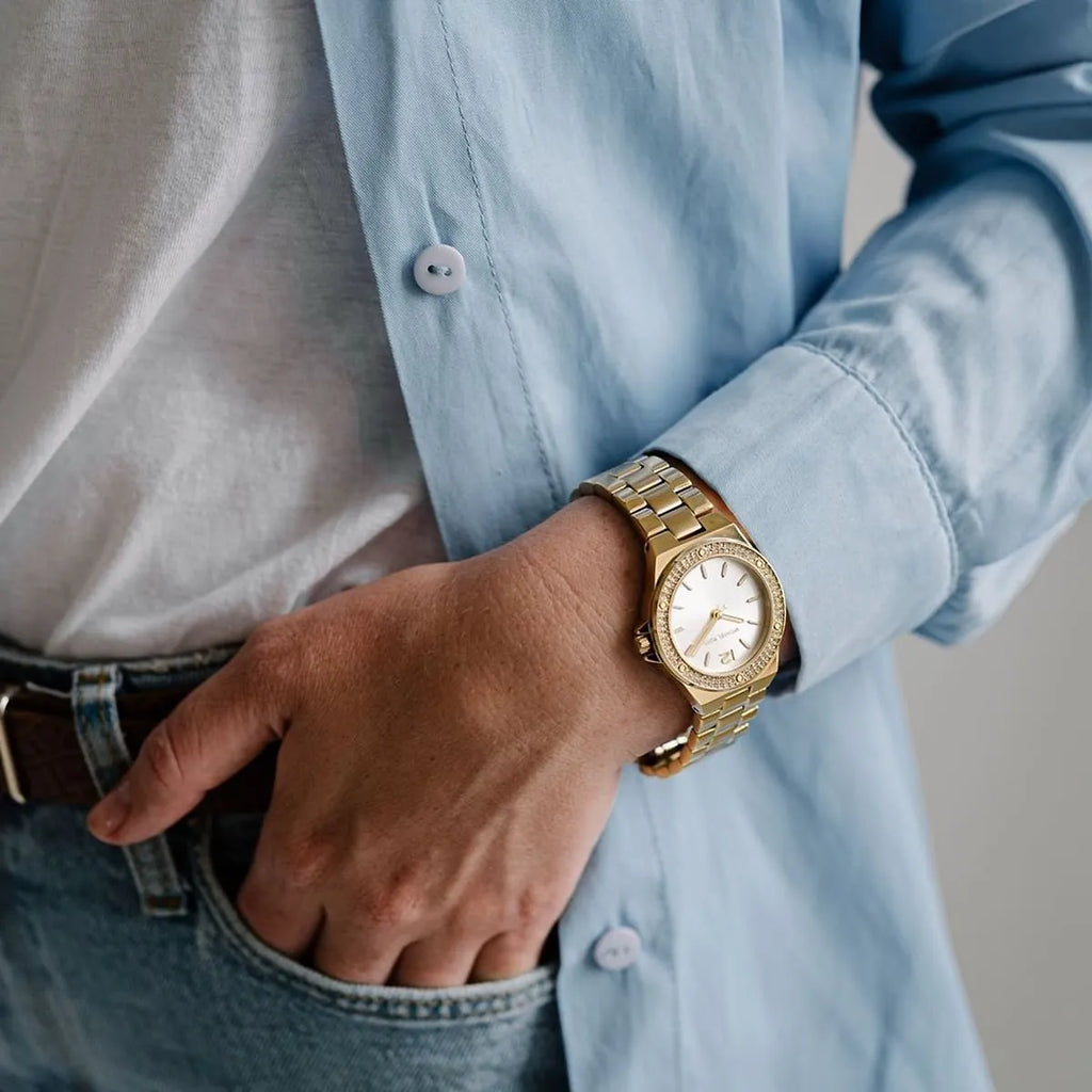The stainless steel bracelet , in a luxurious gold color, harmonizes perfectly with the case of the same shade, offering a sophisticated look .