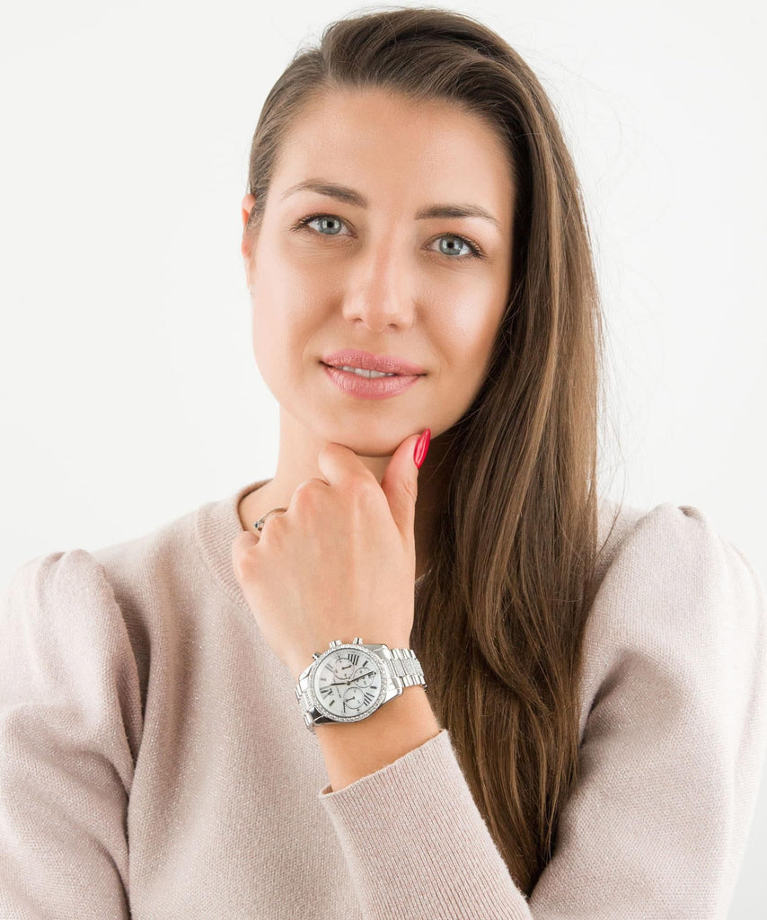 The watch is made of steel. Details: quartz movement, mother-of-pearl dial, mineral glass, water resistance 30WR, Roman numerals, indexes, bezel and bracelet inlaid with crystals, bracelet with folding clasp.The Michael Kors Lexington MK7243 is a watch designed for the woman who appreciates a touch of luxury in her everyday life. The 38mm white chronograph dial offers a clean, modern aesthetic with classic Roman numerals for easy readability. Crafted from sleek silver stainless steel and water-resistant up to 100 meters, this watch transitions flawlessly from work to weekend adventures. The reliable quartz movement ensures accurate timekeeping, making it a perfect companion for any occasion.