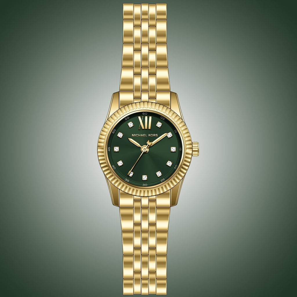 Michael Kors' 26mm Lexington watch features a green sunray dial, three-hand movement and gold-tone stainless steel bracelet.