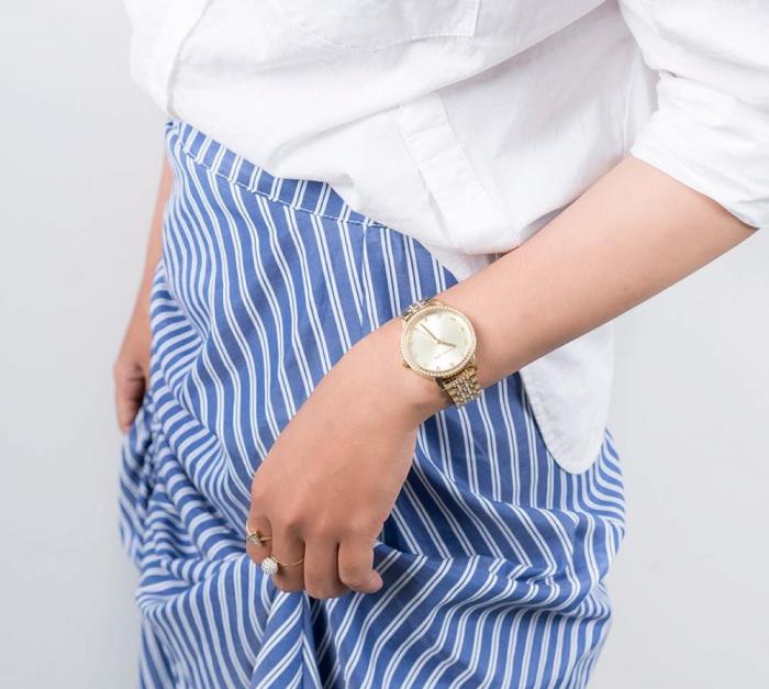 Introducing the Michael Kors Melissa Quartz watch for women, featuring a luxurious gold dial and gold steel strap. With precision quartz movement, this watch will keep you on time and on trend. Elevate your style with this stunning timepiece.
