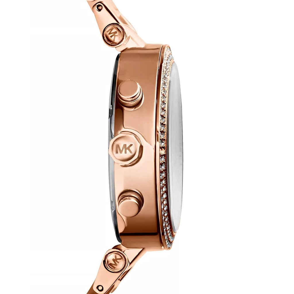 Michael Kors Parker MK5896 is a beautiful and trendy Ladies watch. It has a PVD rose plated stainless steel case and bracelet, with pink blush center links, and sparkling stone set bezel. Inside the watch is a quartz chronograph movement, with 30 minute counters, date, and 24 hour sub dial. The dial is pink to match the bracelet links, with stone set markers.
