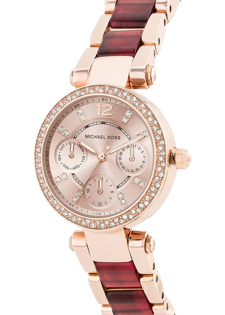 This rose gold-tone and amber tort acetate Michael Kors watch doubles up on sparkle with a pave crystal top ring and indexes.