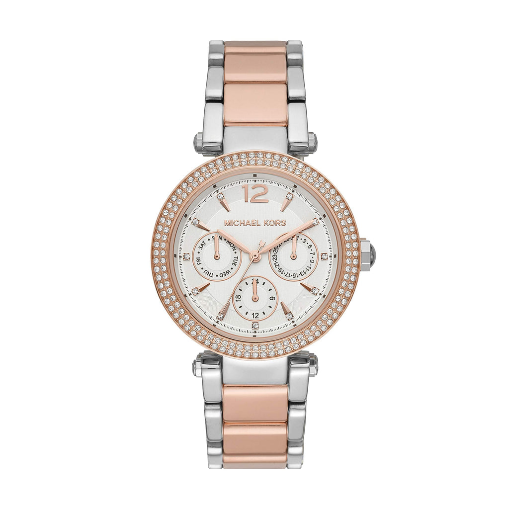 Introducing the Michael Kors Parker watch for women, featuring a white dial and two-tone steel strap. The classic design and durable materials make this watch perfect for everyday wear. With its reliable accuracy and elegant style, the MK5820 is a must-have for any watch collection.
