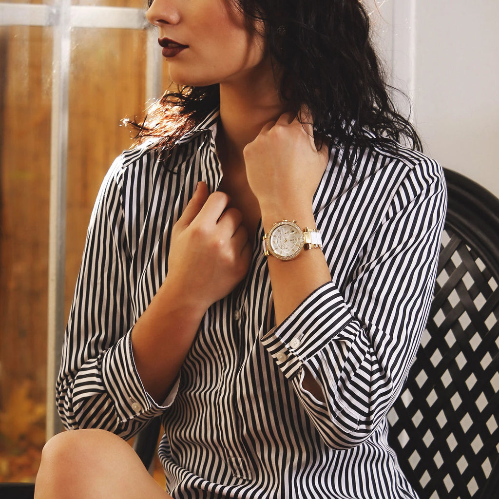 Gold-tone stainless steel case with a gold-tone stainless steel bracelet with white acetate center links. Fixed gold-tone bezel set with crystals. White dial with gold-tone hands and crystal index hour markers. Water resistant to 50 meters. Sleek white acetate gives the elegant Michael Kors Parker watch in gold-tone a modern touch.