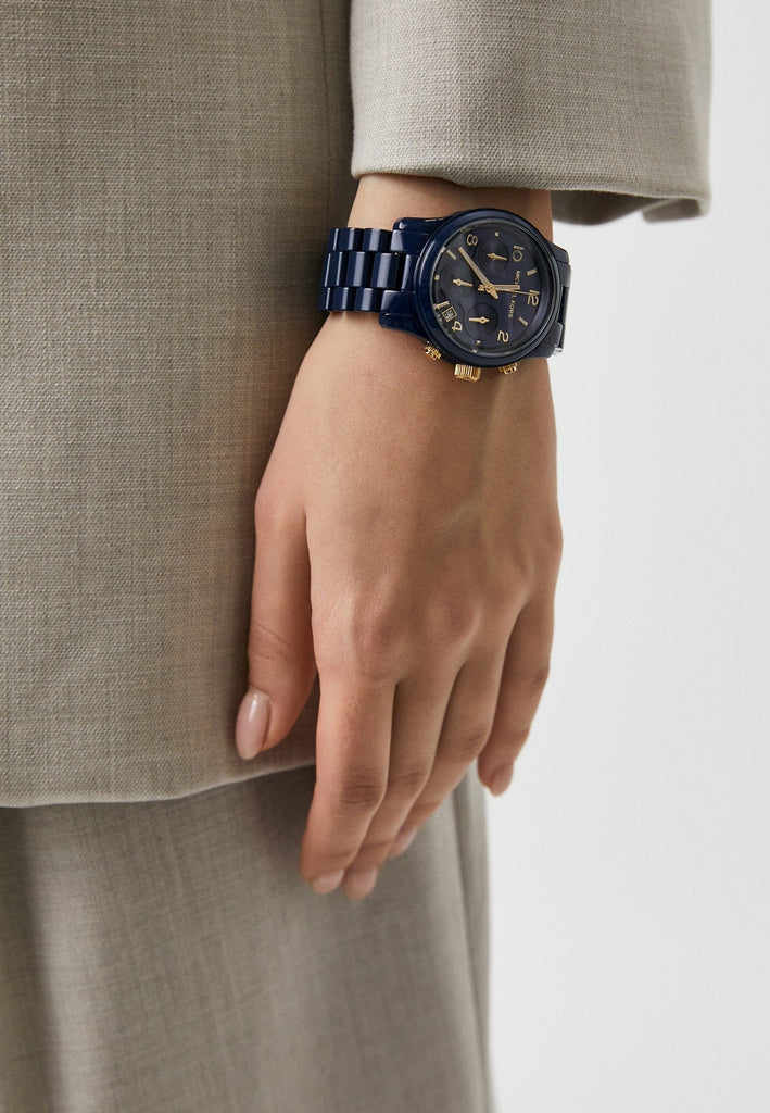 Style and performance perfectly combine together to form this women's analog watch that is brought to you by Michael Kors. The blue round dial is protected by a mineral glass. The Iconic Runway makes its return in this 38mm navy-coated stainless steel watch.