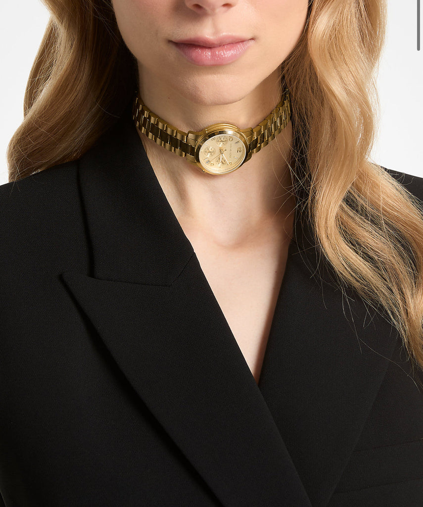 The newest addition to our Runway watch series is a decadent timepiece with everlasting style. Crafted from gold-tone stainless steel, it features chronograph details for precise timekeeping and an elongated bracelet strap that can be wrapped around the arm or worn at the neck as a choker. Complete with raised sub dials, this piece will add a modern finish to any ensemble.