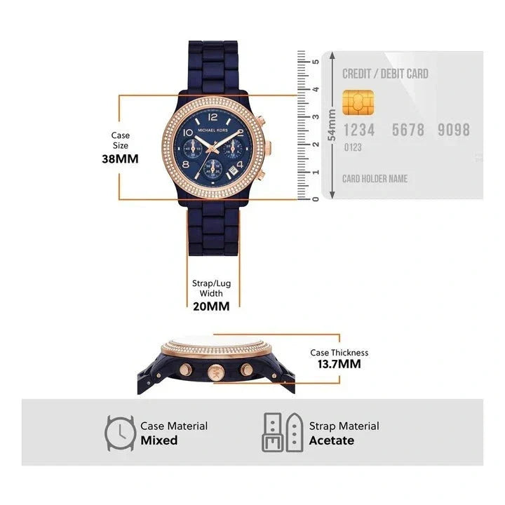 Carry great technology wrapped around your wrist with this stylish women's analog watch from Michael Kors. The blue round dial is protected by a mineral glass. It has a crown for time adjustment. The acetate strap comes in a blue hue that further elevates the look of the timekeeper. Besides, it is completed with a double locking fold-over clasp to ensure a secure fit on the wrist.