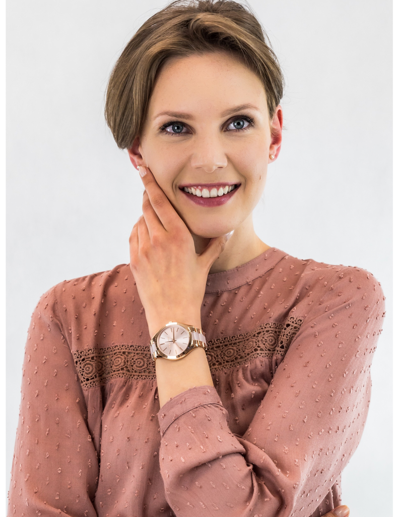- Pink gold-tone watch featuring textured pink sunray dial with logo and rose gold-tone stick indices