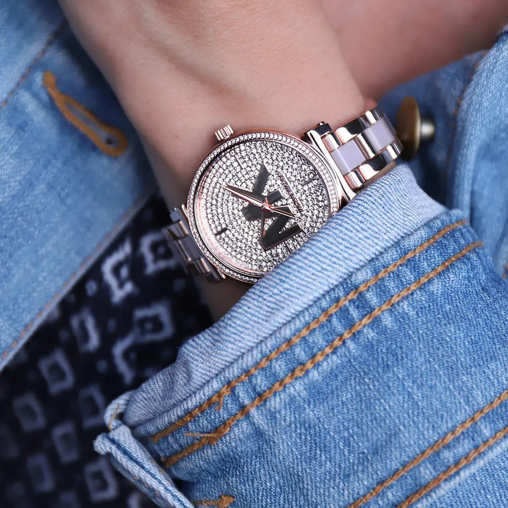 This 36mm Sofie watch features a rose gold-tone sunray dial with all-over pave detailing and MK logo, three-hand movement and rose gold-tone stainless steel bracelet with blush acetate center links.