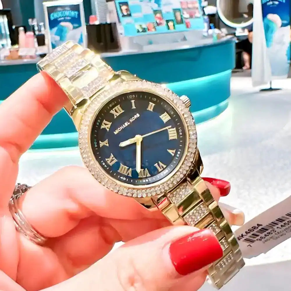 Michael Kors Tibby Multifunction Analog Black Dial Gold Steel Strap Watch for Women - MK4684