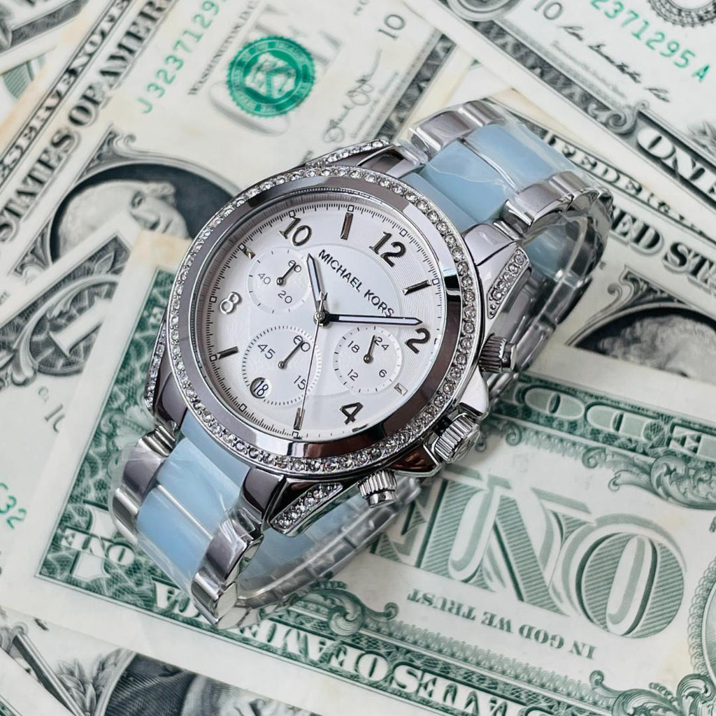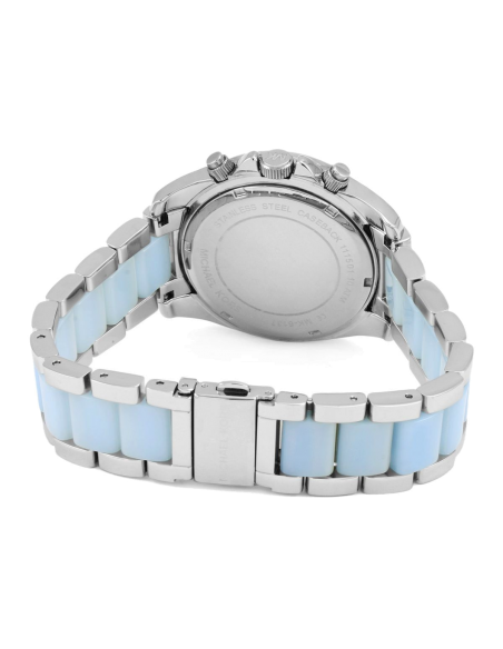 This Michael Kors Blair Chronograph Silver Dial with Chambray Acetate Ladies Watch MK6137 comes with a stainless steel bracelet with chambray acetate center links. Fixed stainless steel bezel set with crystals. Silver dial with silver-tone hands and alternating Arabic numeral and index hour markers. Minute markers around the outer rim. Dial Type: Analog. Luminescent hands and markers. Date display at the 6 o'clock position. Chronograph - three sub-dials displaying: 60 second, 60 minute and 24 hour. Quartz movement. Scratch resistant mineral crystal. Pull / push crown. Solid case back. Case diameter: 39 mm. Case thickness: 12 mm. Round case shape. Band width: 20 mm. Band length: 7.2 inches. Deployment clasp with push button release. Water resistant at 100 meters / 330 feet. Functions: chronograph, date, hour, minute, second. Casual watch style. Michael Kors Blair Chronograph Silver Dial Stainless Steel with Chambray Acetate Ladies Watch MK6137.