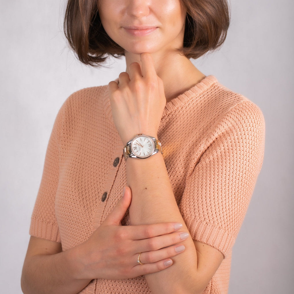 Stainless steel case with a tri-color (silver-tone, gold-tone, rose gold-tone) stainless steel bracelet. Fixed rose gold-tone bezel set with crystals. White sunray dial with gold-tone hands and crystal-tipped index hour markers. Roman numerals appear at the 6 and 12 o'clock positions. Dial Type: Analog. Quartz movement.