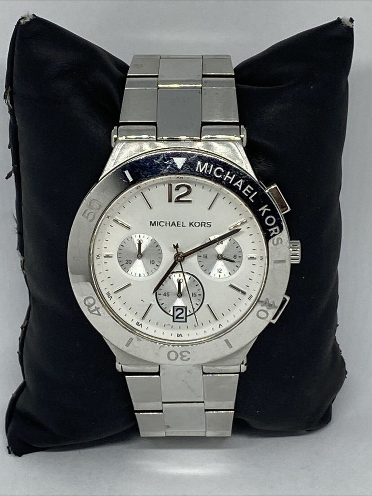 Brushed silver-white dial with polished silver-tone logo applique, Polished silver-tone stainless steel bezel with engraved logo, Arabic numbers and indices, Oversize polished silver-tone stainless steel round case with brushed accents, Stainless steel crown, Stainless steel selector buttons, Stainless steel screw-down caseback, Mineral crystal, 10 ATM (100 meters/330 feet water resistant)