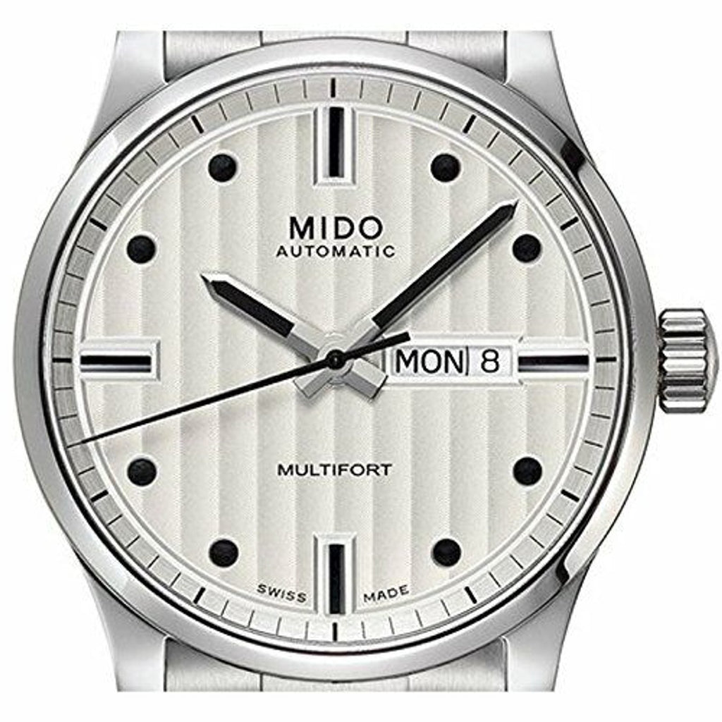 Mido calibre Powermatic 80 (ETA C07.621) automatic movement with an 80-hour power reserve. Scratch resistant sapphire crystal. Transparent case back. Case size: 42 mm. Case thickness: 10.95 mm. Round case shape. Band width: 22 mm. Fold over clasp with a push button release. Water resistant at 100 meters / 330 feet. Functions: date, day, hour, minute, second. Dress watch style. Mido Multifort Automatic Silver Dial Men's Watch M005.430.11.031.80.