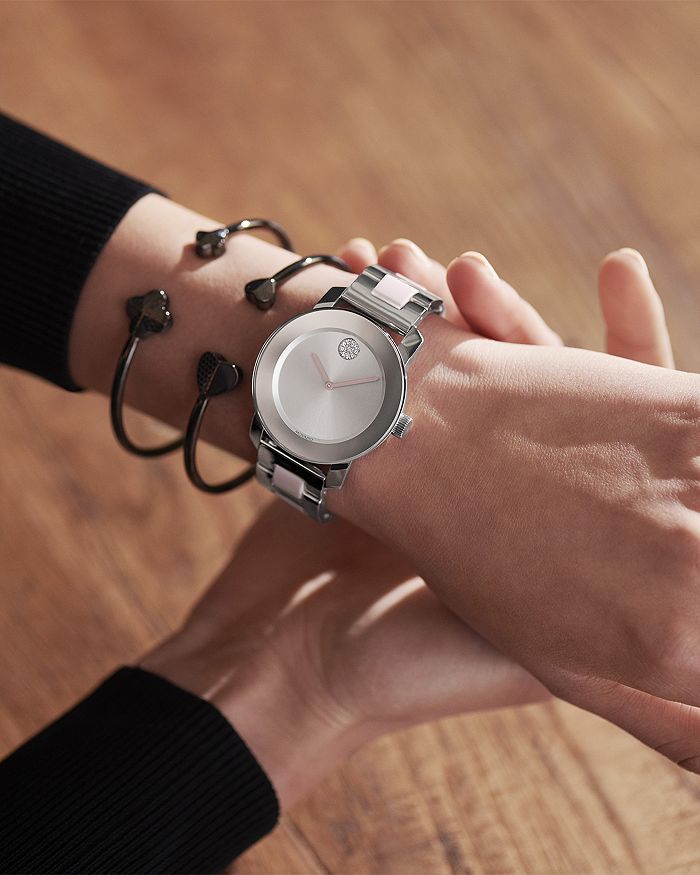 Stainless steel case with a stainless steel bracelet with white ceramic inserts. Fixed stainless steel bezel. Silver metallic dial with silver-tone hands. A crystal-set Movado dot appears at the 12 o'clock position. Dial Type: Analog. Quartz movement. Scratch resistant K1 mineral crystal. Pull / push crown. Solid case back. Round case shape. Case size: 36 mm. Case thickness: 10 mm. Band width: 14 mm. Fold over clasp with a push button release. Water resistant at 30 meters / 100 feet. Functions: hour, minute. Dress watch style. Watch label: Swiss Made. Movado Bold Ceramic Quartz Ladies Watch 3600638.