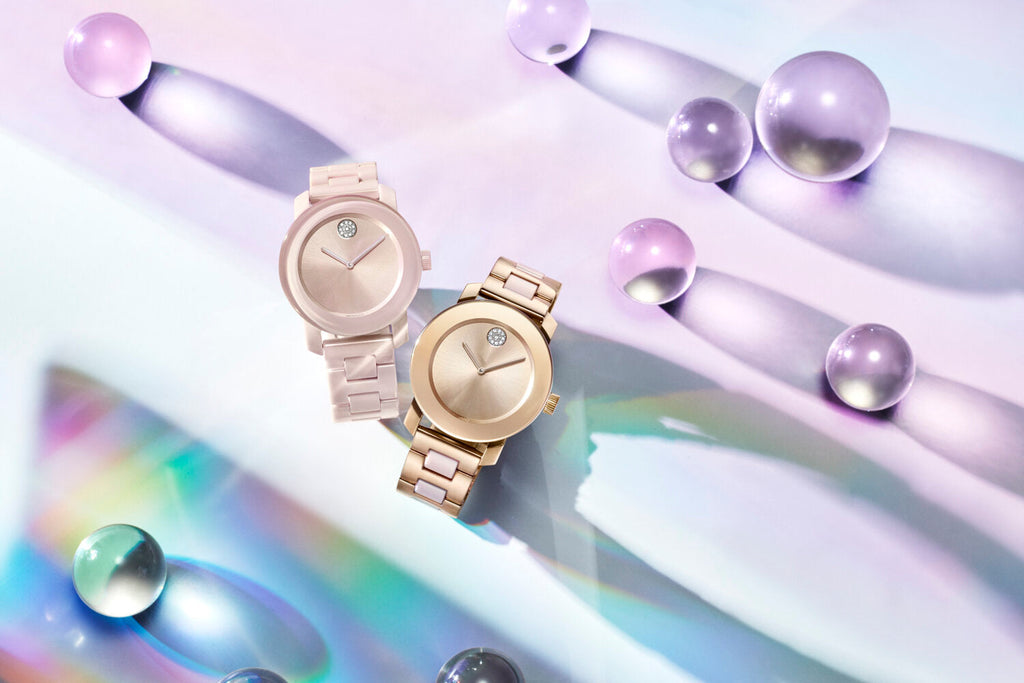 Pale rose gold ion-plated stainless steel case with a pale rose gold ion-plated stainless steel bracelet with blush ceramic links. Fixed pale rose gold ion-plated bezel. Rose metallic dial with pale rose gold-tone hands. No markers. Crystal-set Movado dot appears at the 12 o'clock position. Dial Type: Analog. Quartz movement. Scratch resistant K1 mineral crystal. Pull / push crown. Solid case back. Round case shape. Case size: 36 mm. Case thickness: 10 mm. Band width: 14 mm. Fold over clasp with a push button release. Water resistant at 30 meters