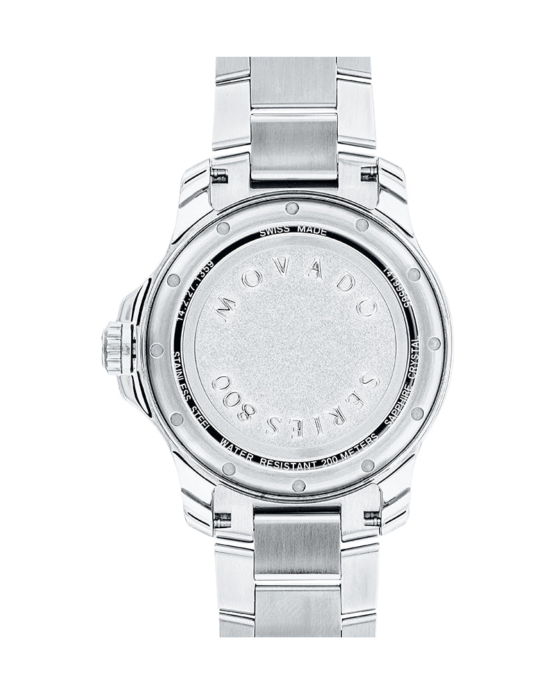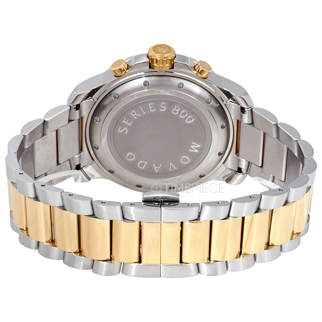 Quartz movement. Scratch resistant sapphire crystal. Pull / push crown. Solid case back. Round case shape. Case size: 42 mm. Band width: 21 mm, band length: 8 inches. Fold over with push button clasp. Water resistant at 200 meters / 660 feet. Functions: chronograph, date, hour, minute, second. Casual watch style. Watch label: Swiss Made. Movado Series 800 Chronograph Black Dial Two-Tone Mens Watch 2600138.